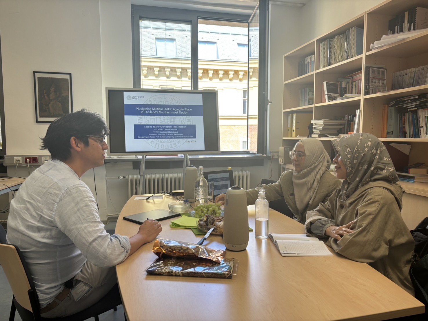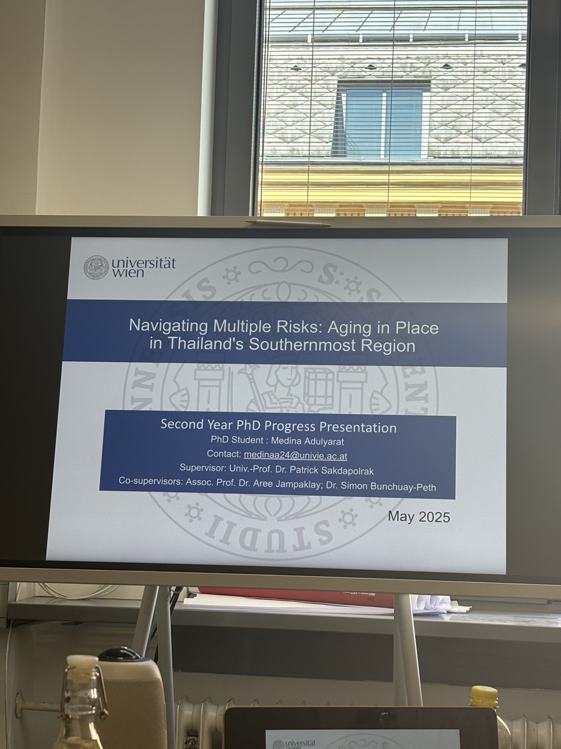 ระหว่างวันที่ 12-16 พฤษภาคม 2568 รศ. ดร.อารี จำปากลาย สถาบันวิจัยประชากรและสังคม ม.มหิดล ได้รับเชิญจาก Professor Patrick Sakdapolarak, Department of Geography and Regional Research, University of Vienna ในฐานะอาจารย์ที่ปรึกษาร่วมของ นางสาวเมดินา อดุลยรัตน์ นักศึกษาปริญญาเอก ซึ่งกำลังทำวิทยานิพนธ์ในหัวข้อ Navigating multiple risks: Aging in place in Thailand’s southernmost provinces เพื่อให้คำแนะนำร่างบทความเพื่อตีพิมพ์จำนวน 3 บทความ ณ มหาวิทยาลัยเวียนนา ประเทศออสเตรีย