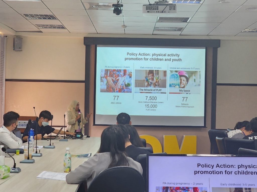วันที่ 20 พฤษภาคม 2566 รองศาสตราจารย์ ดร. ปิยวัฒน์ เกตุวงศา ผู้อำนวยการศูนย์พัฒนาองค์ความรู้ด้านกิจกรรมทางกายประเทศไทย (ทีแพค) และ อาจารย์ ดร.ดียะฮฺ อนานตาเลีย วิดิยาสตาริ หัวหน้ากลุ่มงานพัฒนาเครือข่ายวิชาการนานาชาติ พร้อมด้วยนางสาววณิสรา เจริญรมย์ และนางสาวนฤมล เหมะธุลิน นักวิจัยศูนย์พัฒนาองค์ความรู้ด้านกิจกรรมทางกายประเทศไทย สถาบันวิจัยประชากรและสังคม มหาวิทยาลัยมหิดล ได้เข้าร่วมการประชุมวิชาการ 2023 Taiwan International Conference on Physical Activity and Exercise Science ระหว่างวันที่ 20-21 พฤษภาคม 2566 ณ International Conference Hall, Social Science and Management Building, National Chung Hsing University, Taichung, Taiwan โดยมีเครือข่ายนักวิชาการ นักวิจัย เข้าร่วมการประชุมและนำเสนอผลงาน ทั้งหมด 13 ประเทศ โดยมี 6 Keynote Speaker และ 5 Special Symposium ซึ่งอาจารย์ ดร.ดียะฮฺ อนานตาเลีย วิดิยาสตาริ ได้นำเสนอหัวข้อ Thailand’s Report Card on Physical Activity for Children and Youth:What Do We Learn from the Past 6 Years? ในช่วงของ Special Symposium (I):Kids and Youth Physical Activity in Asia Region I: Post COVID 19 Current Situation and Future Challenge