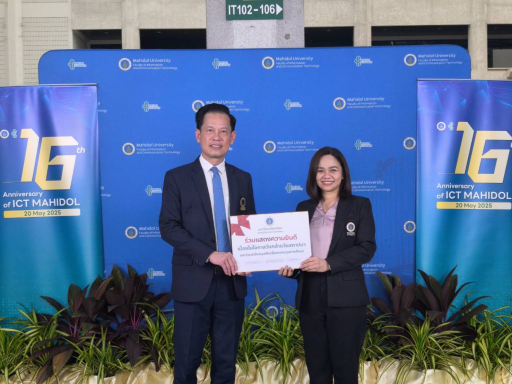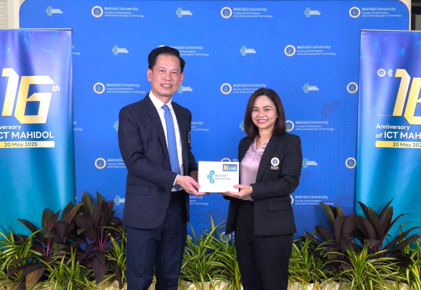 วันที่ 20 พฤษภาคม 2568 รศ. ดร.ศุทธิดา ชวนวัน รองผู้อำนวยการฝ่ายบริหารงานทั่วไป สถาบันวิจัยประชากรและสังคม ร่วมมอบทุนและแสดงความยินดีเนื่องในงานวันคล้ายวันสถาปนาคณะเทคโนโลยีสารสนเทศและการสื่่อสาร (ICT) ครบรอบ 16 ปี โดยมี อาจารย์ ดร.พัฒนศักดิ์ มงคลวัฒน์ คณบดีคณะเทคโนโลยีสารสนเทศและการสื่อสาร ให้การต้อนรับ ณ คณะเทคโนโลยีสารสนเทศและการสื่่อสาร (ICT) มหาวิทยาลัยมหิดล
