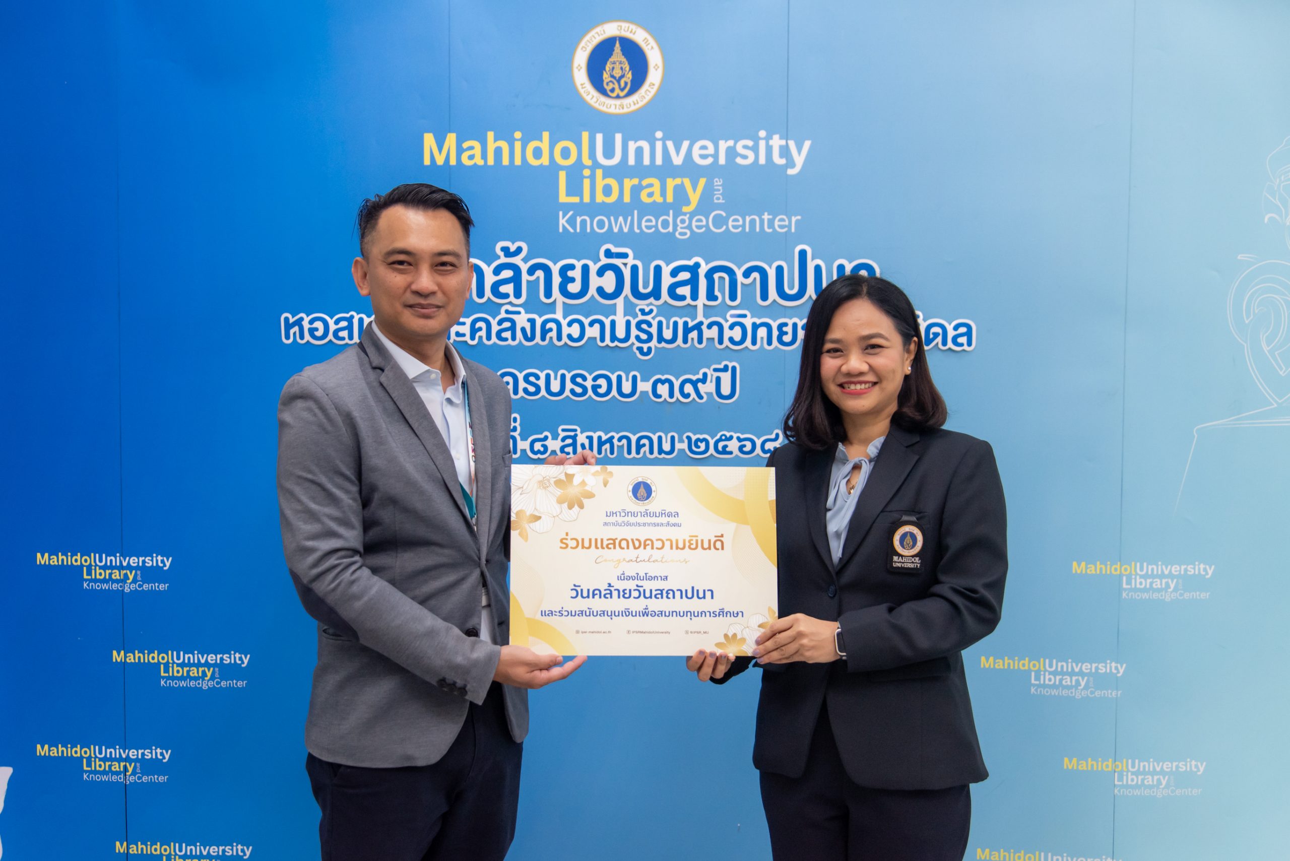 วันที่ 8 สิงหาคม 2568 รองศาสตราจารย์ ดร.ศุทธิดา ชวนวัน รองผู้อำนวยการฝ่ายบริหารงานทั่วไป สถาบันวิจัยประชากรและสังคม มหาวิทยาลัยมหิดล ร่วมแสดงความยินดีและมอบทุนสนับสนุนการศึกษาเนื่องในวันคล้ายวันสถาปนาหอสมุดและคลังความรู้มหาวิทยาลัยมหิดล ครอบรอบ 39 ปี โดยมี อาจารย์ ดร.เอกชัย วารินศิริรักษ์ รองผู้อำนวยการฝ่ายนวัตกรรมบริการห้องสมุด ให้การต้อนรับ ณ ชั้น 3 หอสมุดและคลังความรู้มหาวิทยาลัยมหิดล
