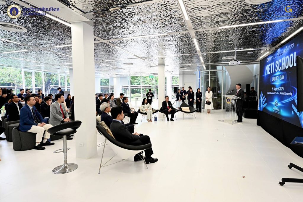 วันอังคารที่ 19 สิงหาคม 2568 นางสาวสลักจิต ชื่นชม นักวิจัยโครงการฯ สถาบันวิจัยประชากรและสังคม ม.มหิดล ได้รับมอบหมายให้ทำหน้าที่พิธีกรดำเนินรายการของงานพิธีเปิดอาคาร Mahidol Entrepreneurship, Technology & Innovation School (METI School) ณ อาคารบัณฑิตวิทยาลัย ม.มหิดล โดยงานนี้ได้รับเกียรติจาก ศาสตราจารย์ นายแพทย์ปิยะมิตร ศรีธรา อธิการบดี มหาวิทยาลัยมหิดล เป็นประธานกล่าวเปิดอาคารอย่างเป็นทางการ และมี ศาสตราจารย์ ดร.ฉัตรเฉลิม อิศรางกูร ณ อยุธยา คณบดีบัณฑิตวิทยาลัย มหาวิทยาลัยมหิดล กล่าวรายงานความเป็นมาและวัตถุประสงค์ของโครงการก่อสร้างอาคาร METI School