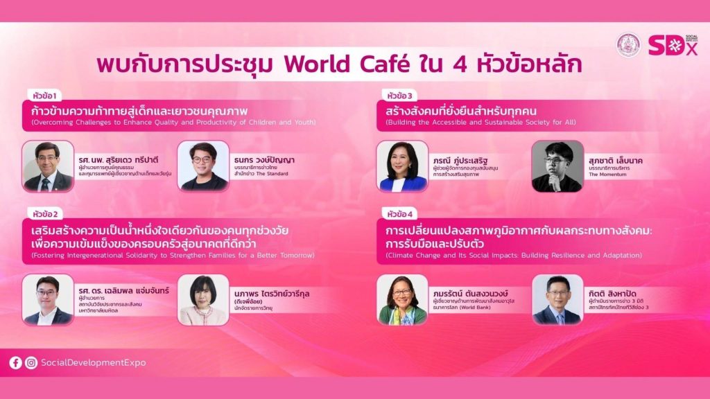 ภายในงาน รศ.ดร.เฉลิมพล แจ่มจันทร์ ยังได้ร่วมเปิดวงเสวนา World Cafe ร่วมกับ คุณนภาพร ไตรวิททย์วารีกุล ในหัวข้อ “เสริมสร้างความเป็นน้ำหนึ่งใจเดียวกันของคนทุกช่วงวัย เพื่อความเข้มแข็งของครอบครัวสู่อนาคตที่ดีกว่า (Fostering Intergeneration Solidarity to Strengthen Families for a Better Tomorrow)” ซึ่งเป็นหนึ่งในกิจกรรมสำคัญของ SDx 2025 เวทีแลกเปลี่ยนความคิดจากผู้เชี่ยวชาญระดับประเทศและนานาชาติ เพื่อร่วมกันสร้างสังคมที่เข้มแข็งและยั่งยืนสำหรับทุกคน