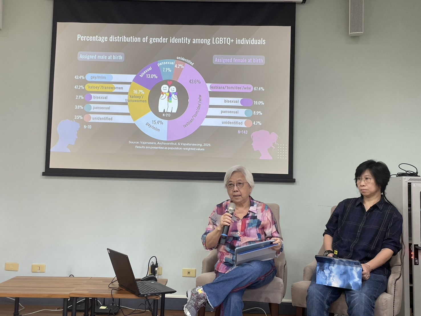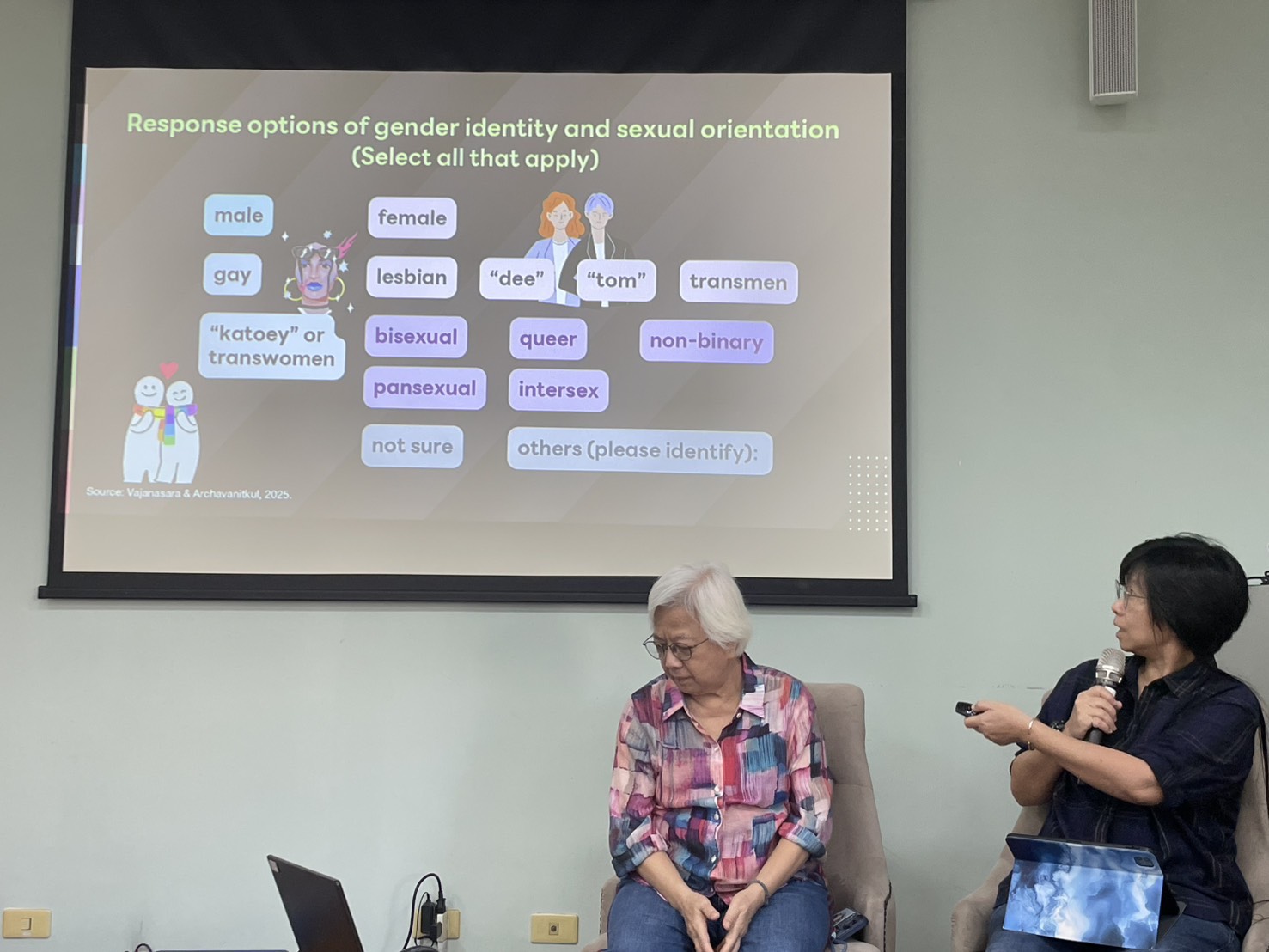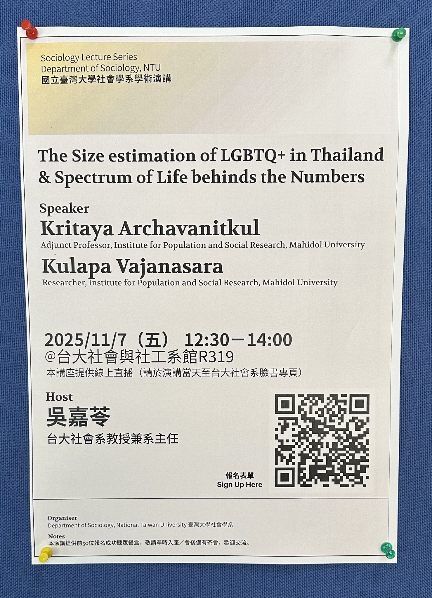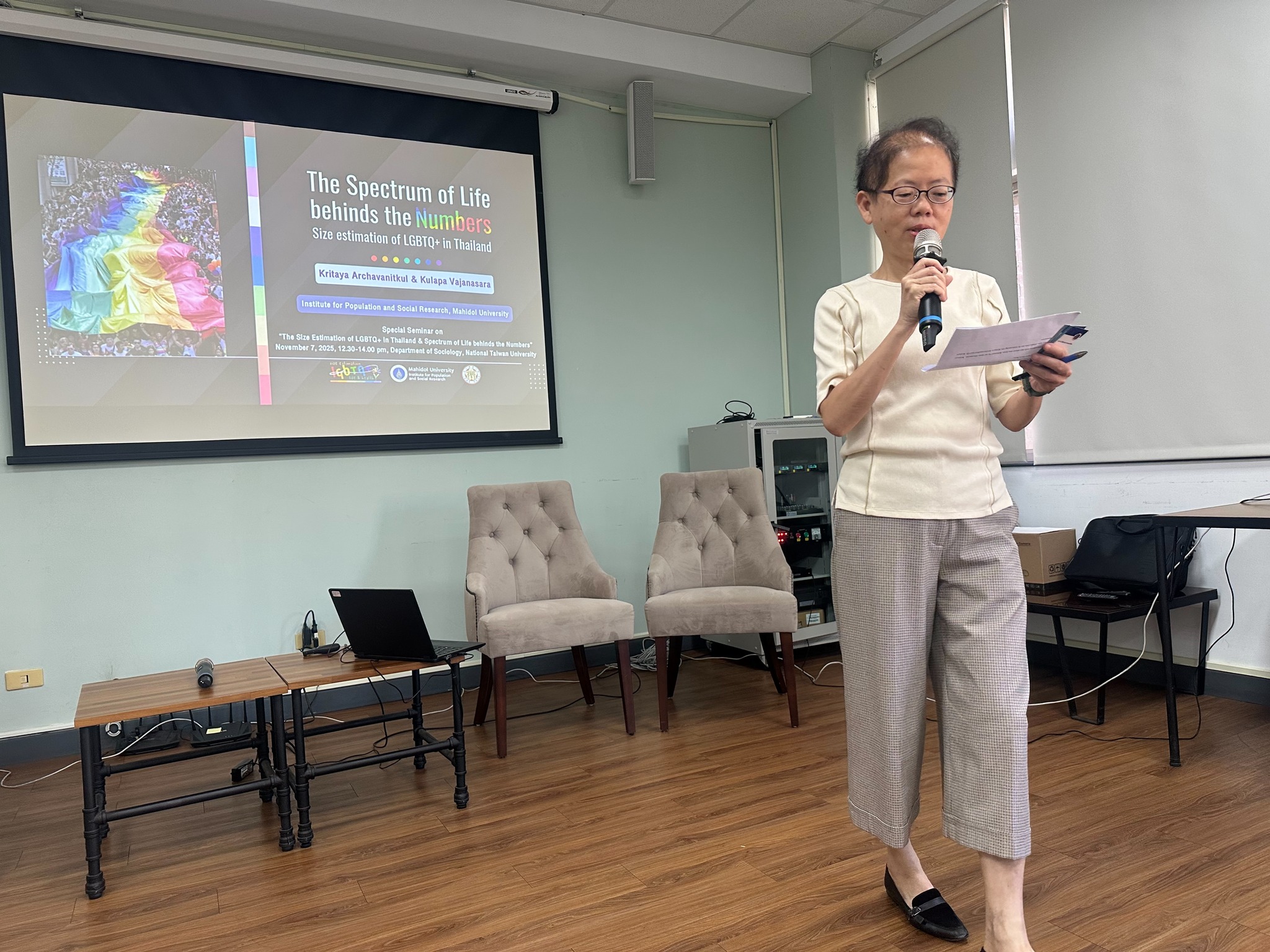 วันที่ 7 พฤศจิกายน 2568 เวลา 12.30 – 14.00 น. Professor Dr. Chia-Ling Wu, Department of Sociology, National Taiwan University ได้เชิญ นางสาวกุลภา วจนสาระ นักปฏิบัติการวิจัย (ผู้ชำนาญการพิเศษ) และ รองศาสตราจารย์ ดร.กฤตยา อาชวนิจกุล สถาบันวิจัยประชากรและสังคม ม.มหิดล นำเสนองานเรื่อง “The Spectrum of Life behinds the Numbers: Size Estimation of LGBTQ+in Thailand” ให้นักศึกษา อาจารย์ และผู้สนใจเข้าร่วมรับฟัง ณ ห้อง 311 ชั้น 3 ภาควิชาสังคมวิทยา และทางออนไลน์