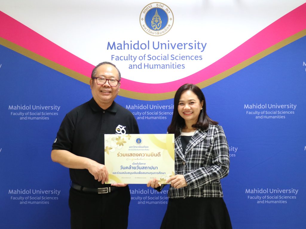 วันที่ 12 ธันวาคม 2568 สถาบันวิจัยประชากรและสังคม นำโดย รศ. ดร.ศุทธิดา ชวนวัน รองผู้อำนวยการฝ่ายบริหารงานทั่วไป ร่วมแสดงความยินดีและมอบทุนสนับสนุนการศึกษาเนื่องในงานวันคล้ายวันสถาปนาคณะสังคมศาสตร์และมนุษยศาสตร์ มหาวิทยาลัยมหิดล ครบรอบ 56 ปี โดยมี รศ. ดร.สมบูรณ์ ศิริสรรหิรัญ รองคณบดีฝ่ายบริหารและพัฒนาอย่างยั่งยืน ณ คณะสังคมศาสตร์และมนุษยศาสตร์ มหาวิทยาลัยมหิดล ศาลายา