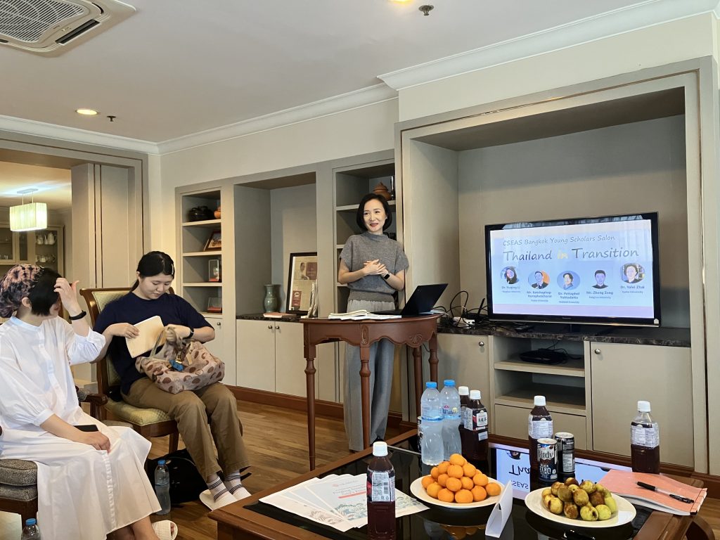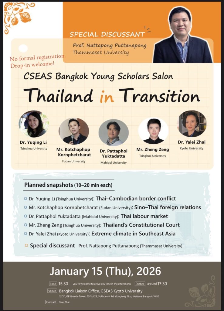 The Center for Southeast Asian Studies (CSEAS), Kyoto University, hosted a Young Scholars Salon in Bangkok on 15 January 2026, bringing together early-career scholars for an informal exchange of ideas on Southeast Asia. The salon featured research snapshots by Dr. Yuqing Li (Tsinghua University) on the Thai–Cambodian border conflict, Mr. Kotchaphop Kornphetcharat (Fudan University) on Sino–Thai foreign relations, Dr. Pattaphol Yuktadatta (Mahidol University) on Thailand’s labour market, Mr. Zheng Zeng (Tsinghua University) on Thailand’s Constitutional Court, and Dr. Yalei Zhai (Kyoto University) on extreme climate in Southeast Asia, followed by open discussion and informal networking over dinner at the CSEAS Bangkok Liaison Office.