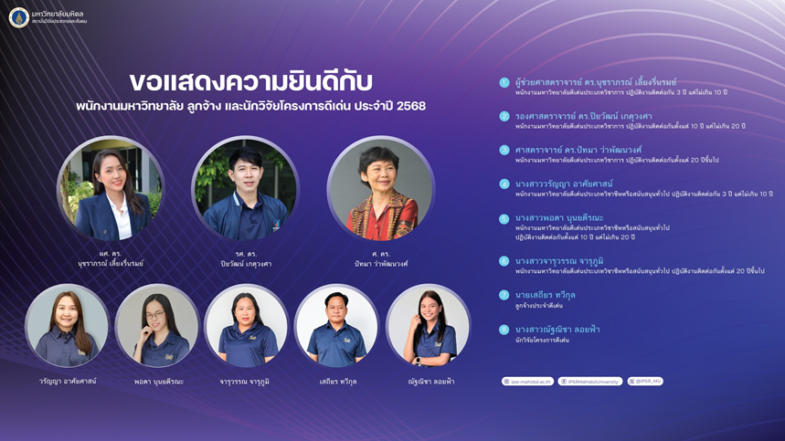 - ผู้ช่วยศาสตราจารย์ ดร.พจนา หันจางสิทธิ์ ผ่านการประเมินคุณภาพการสอน ระดับที่ 2 ตามกรอบมาตรฐานวิชาชีพมหาวิทยาลัยมหิดล (Mahidol Professional Standards Framework: MUPSF)