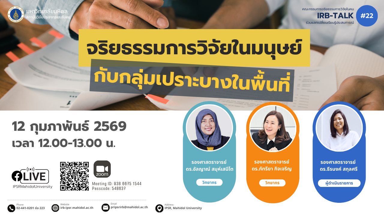 On February 12, 2026, the Human Research Ethics Committee of the Institute for Population and Social Research, Mahidol University organized IRB Talk No. 22 under the theme “Research Ethics in Human Subjects with Vulnerable Populations in Field Settings.”