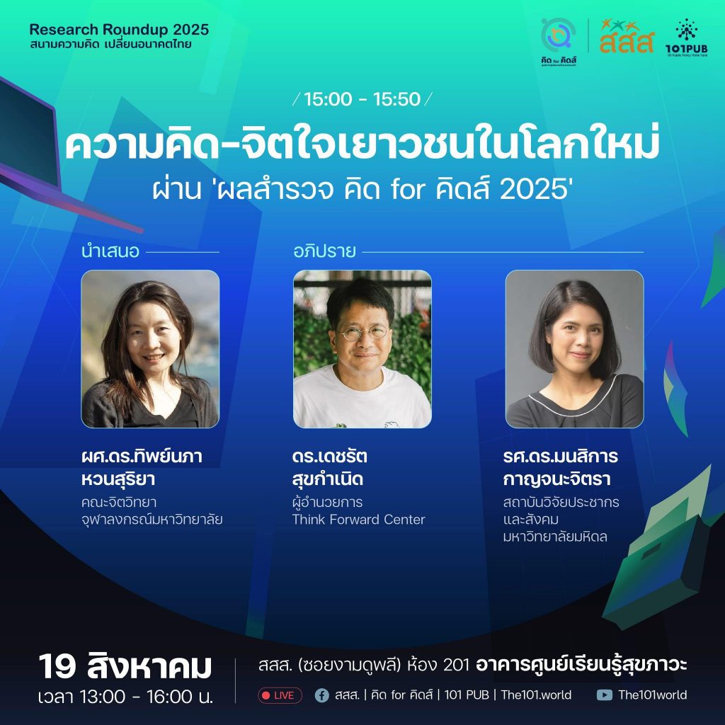 On 19 August 2025, Assoc. Prof. Dr. Manasigan Kanchanachitra of the Institute for Population and Social Research, Mahidol University, joined a panel discussion on Youth Minds in a New World through the “Kid for Kids 2025” Survey Results at the public forum Research Roundup 2025: Growing Up in a New World? From AI to the Future of Work, to the Thoughts and Dreams of Thai Youth.