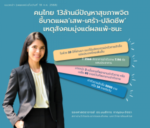 คนไทย13ล้านมีปัญหาสุขภาพจิต ชี้บาดแผล‘เสพ-เศร้า-ปลิดชีพ’เหตุสังคมมุ่งแต่ผลแพ้-ชนะ 18 กรกฎาคม 2568 มัลติมีเดีย