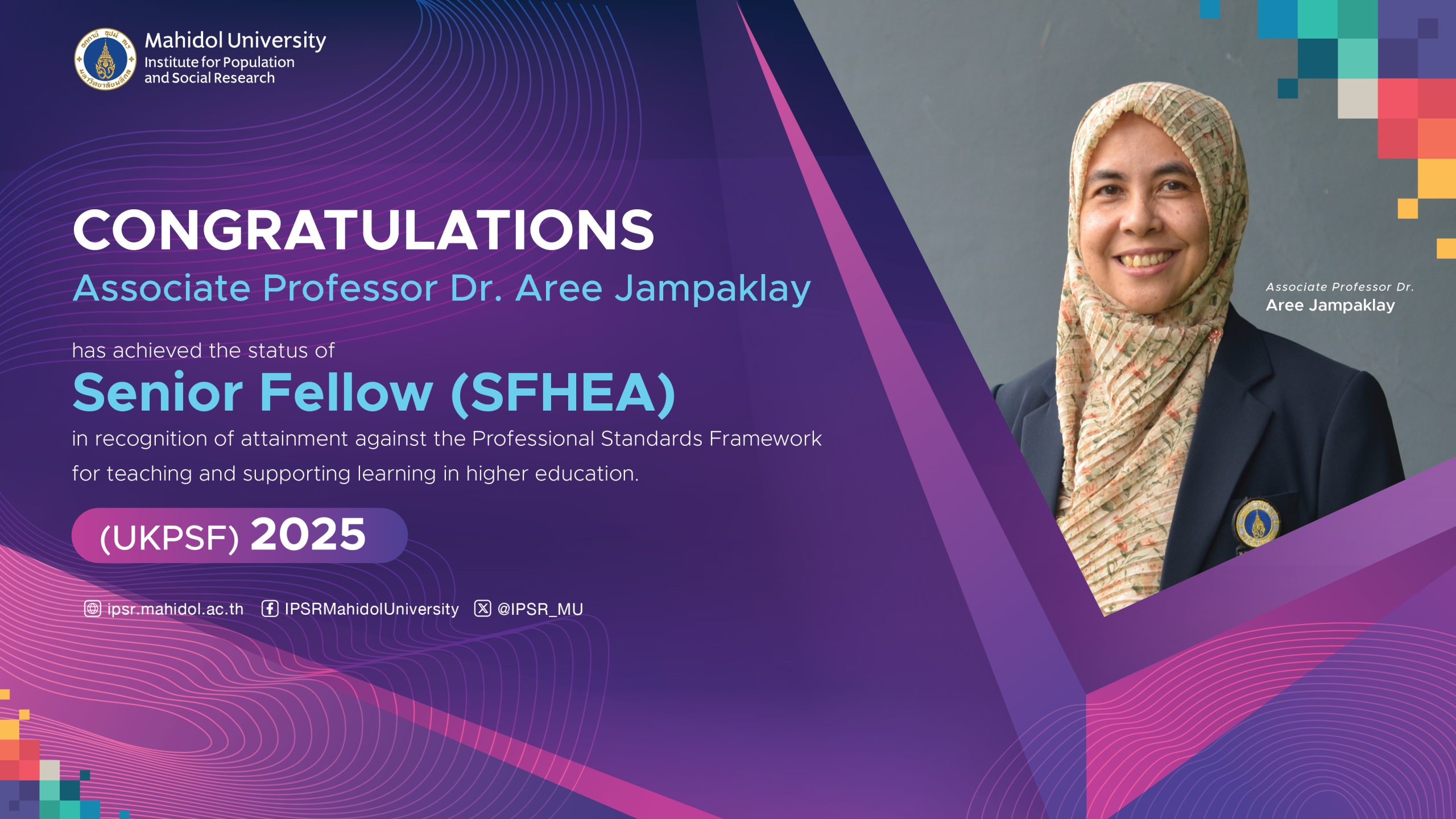 ขอแสดงความยินดีกับ รองศาสตราจารย์ ดร.อารี จำปากลาย สถาบันวิจัยประชากรและสังคม มหาวิทยาลัยมหิดล ในโอกาสผ่านการรับรองมาตรฐานคุณภาพอาจารย์ ตามกรอบมาตรฐานวิชาชีพเพื่อการสอนและการสนับสนุนการเรียนรู้ที่มีคุณภาพของประเทศอังกฤษ (The UK Professional Standards Framework (UKPSF)) ประเภท Senior Fellow (SFHEA) จากองค์กรระดับชาติในสหราชอาณาจักร The Higher Educaiotn Academy (HEA) หรือ AdvanceHE เมื่อวันที่ 19 ธันวาคม 2568
