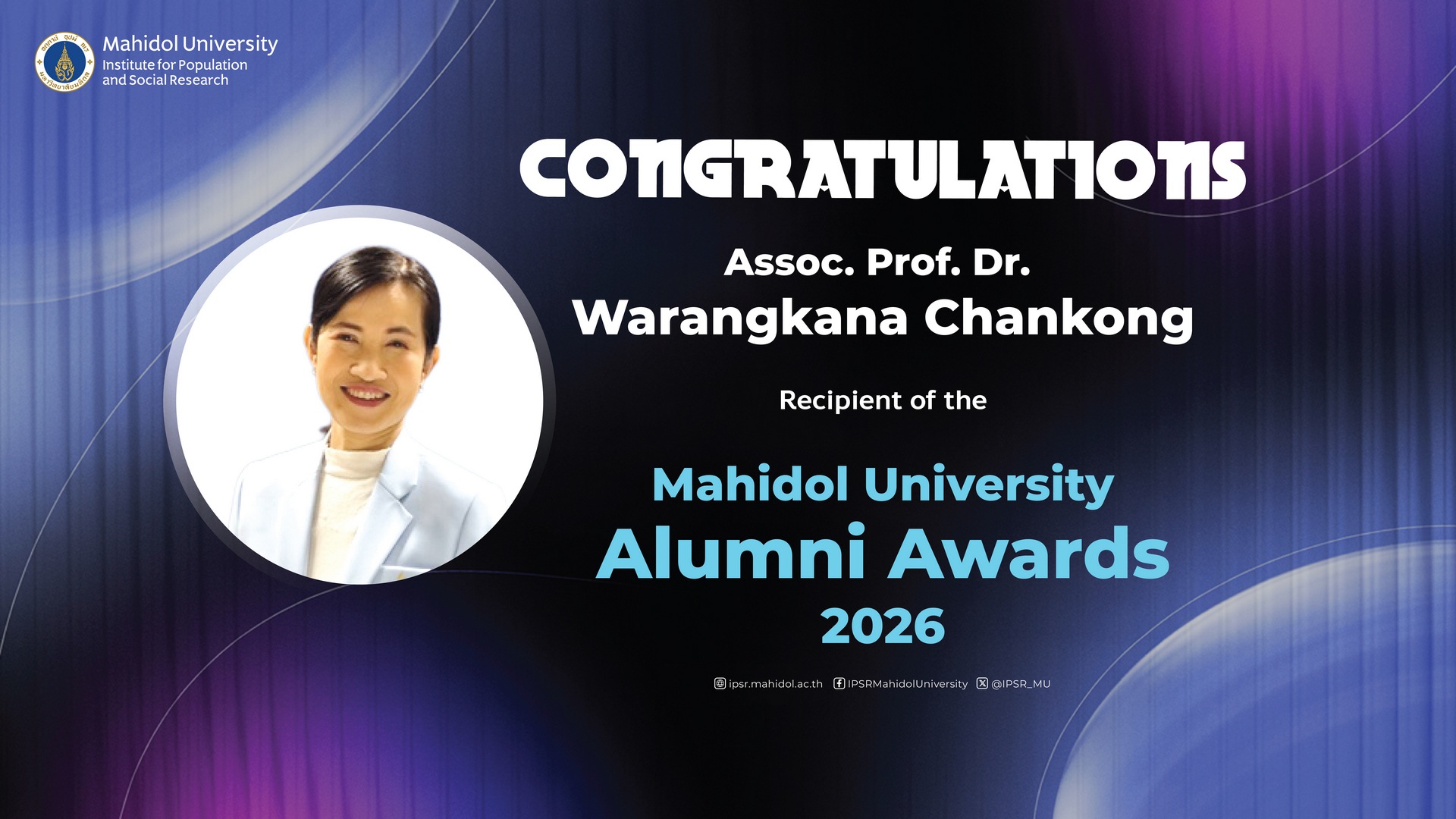 ขอแสดงความยินดีกับศิษย์เก่าสถาบันวิจัยประชากรและสังคม มหาวิทยาลัยมหิดล ที่ได้รับเกียรติและความภาคภูมิใจในเวทีระดับมหาวิทยาลัย ได้แก่ รศ.ดร.วรางคณา จันทร์คง ผู้ได้รับรางวัล Mahidol University Alumni Awards 2026