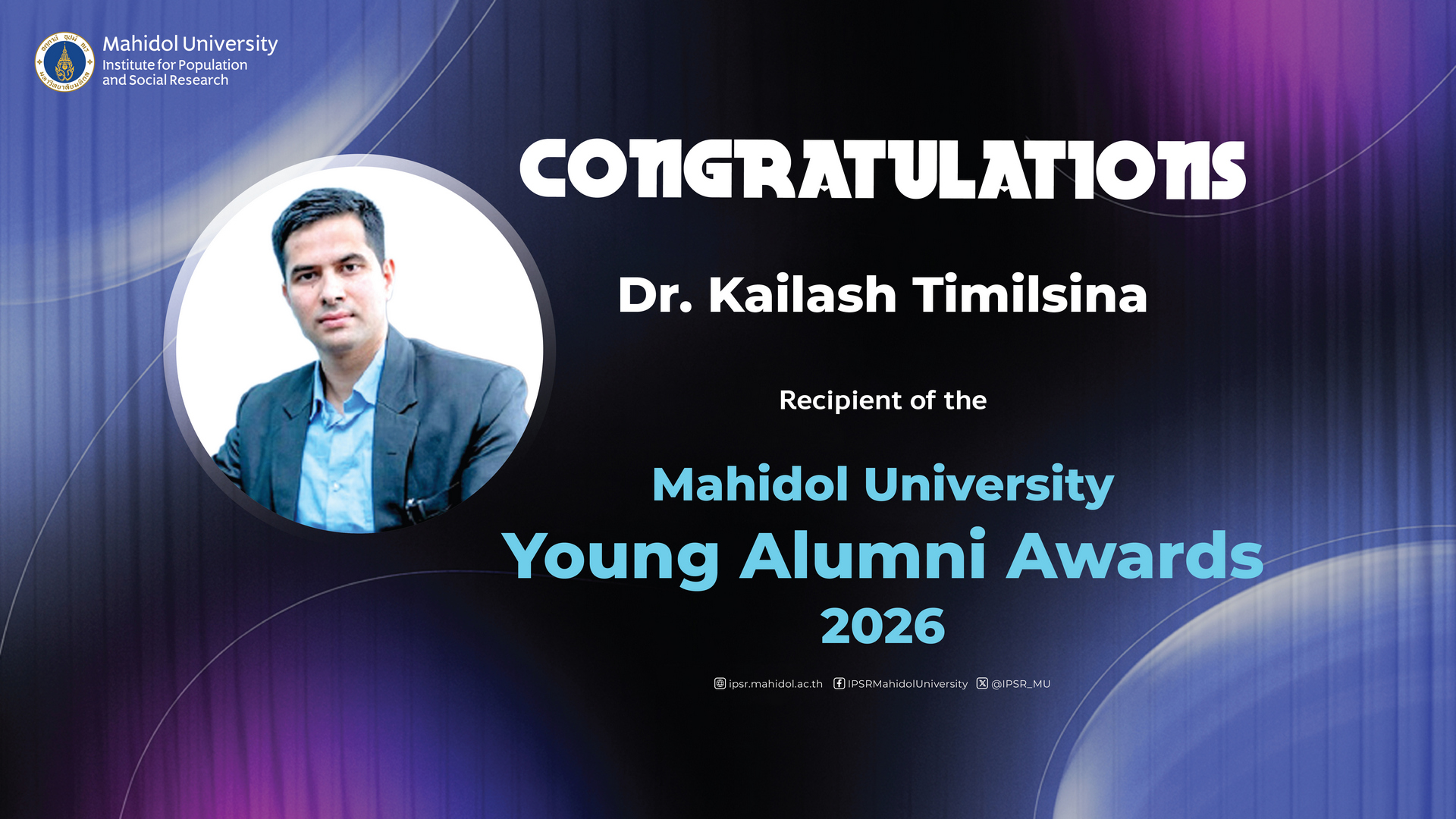 ขอแสดงความยินดีกับศิษย์เก่าสถาบันวิจัยประชากรและสังคม มหาวิทยาลัยมหิดล ที่ได้รับเกียรติและความภาคภูมิใจในเวทีระดับมหาวิทยาลัย ได้แก่ Dr. Kailash Timilsina ผู้ได้รับรางวัล Mahidol University Young Alumni Awards 2026