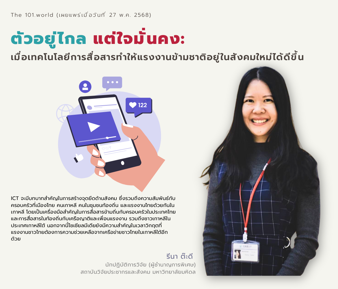 คุณรีนา ต๊ะดี นักปฏิบัติการวิจัย (ผู้ชำนาญการพิเศษ) สถาบันวิจัยประชากรและสังคม มหาวิทยาลัยมหิดล เขียนถึงข้อค้นพบจากงานวิจัยว่าด้วยความสำคัญของเทคโนโลยีสารสนเทศต่อการใช้ชีวิตของแรงงานไทยในเกาหลีใต้