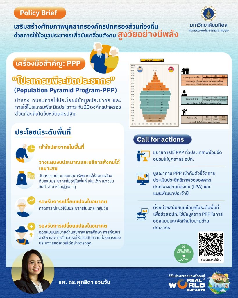 • เสริมสร้างศักยภาพบุคลากรองค์กรปกครองส่วนท้องถิ่น ด้วยการใช้ข้อมูลประชากรเพื่อขับเคลื่อนสังคมสูงวัยอย่างมีพลัง