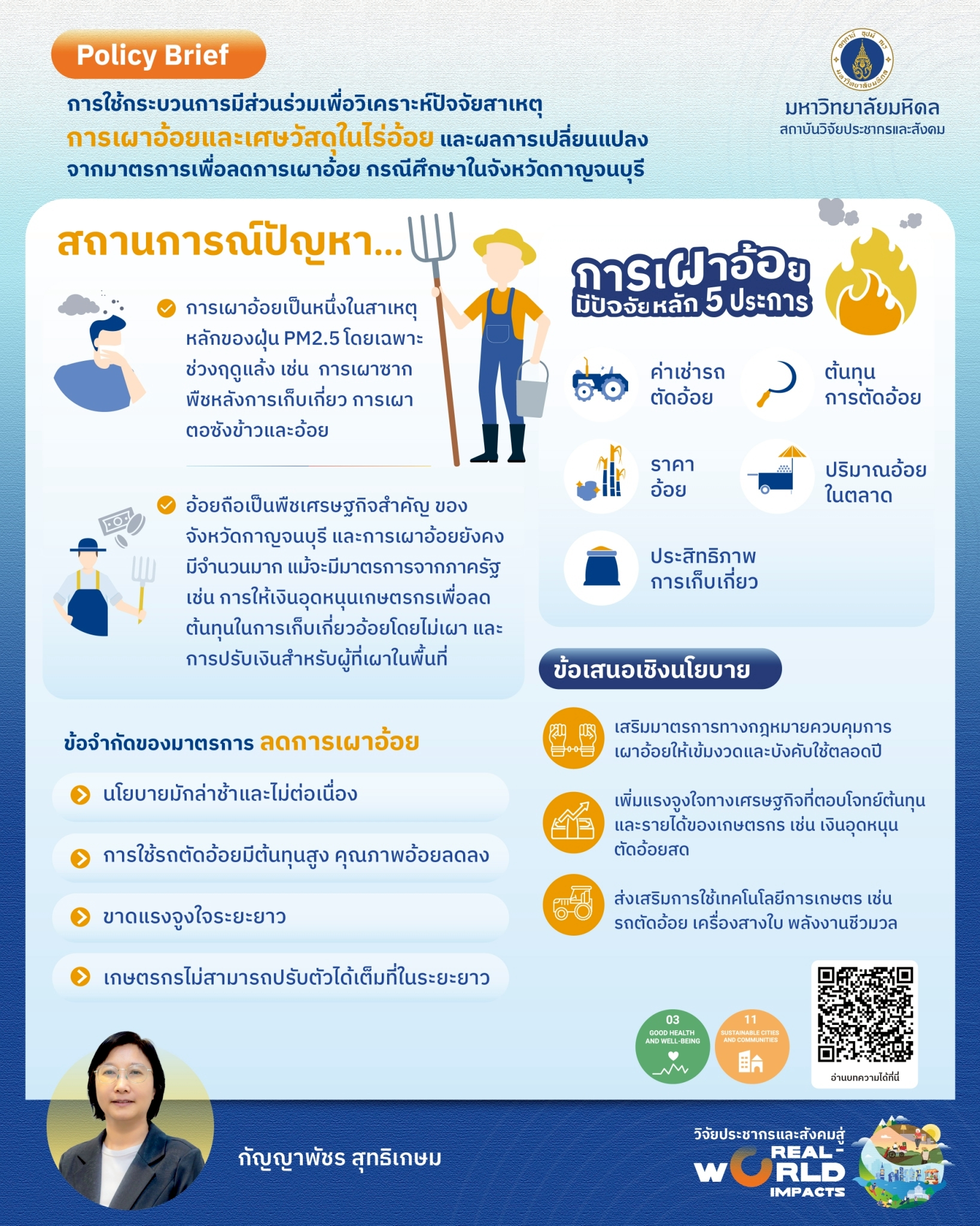 • การใช้กระบวนการมีส่วนร่วมเพื่อวิเคราะห์ปัจจัยสาเหตุการเผาอ้อยและเศษวัสดุในไร่อ้อย และผลการเปลี่ยนแปลงจากมาตราการเพื่อลดการเผาอ้อย กรณีศึกษาในจังหวัดกาญจนบุรี
