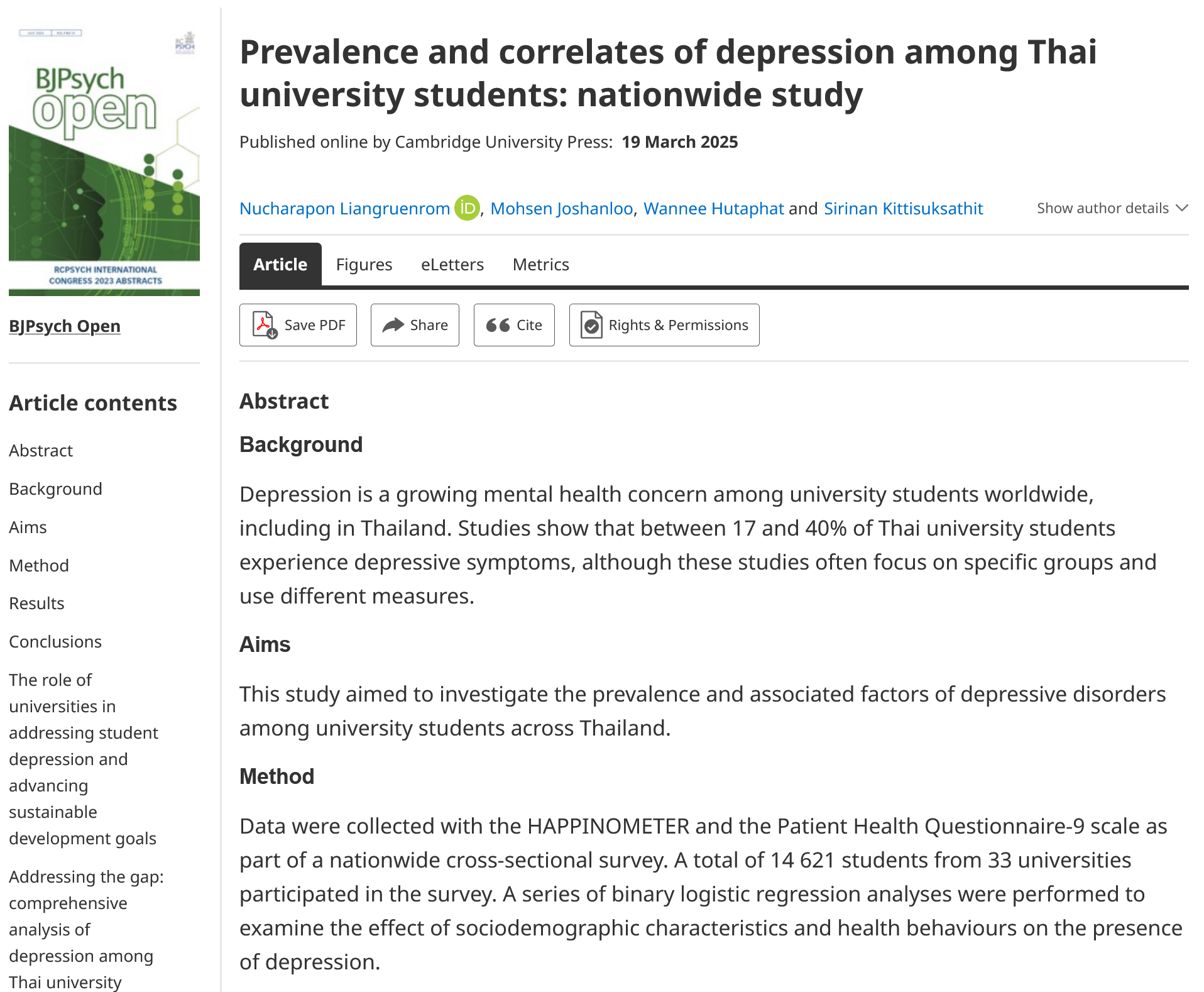 Liangruenrom, N., Joshanloo, M., Hutaphat, W., & Kittisuksathit, S. (2025). Prevalence and correlates of depression among Thai university students: nationwide study. BJPsych Open, 11(2), e59. doi:10.1192/bjo.2025.21