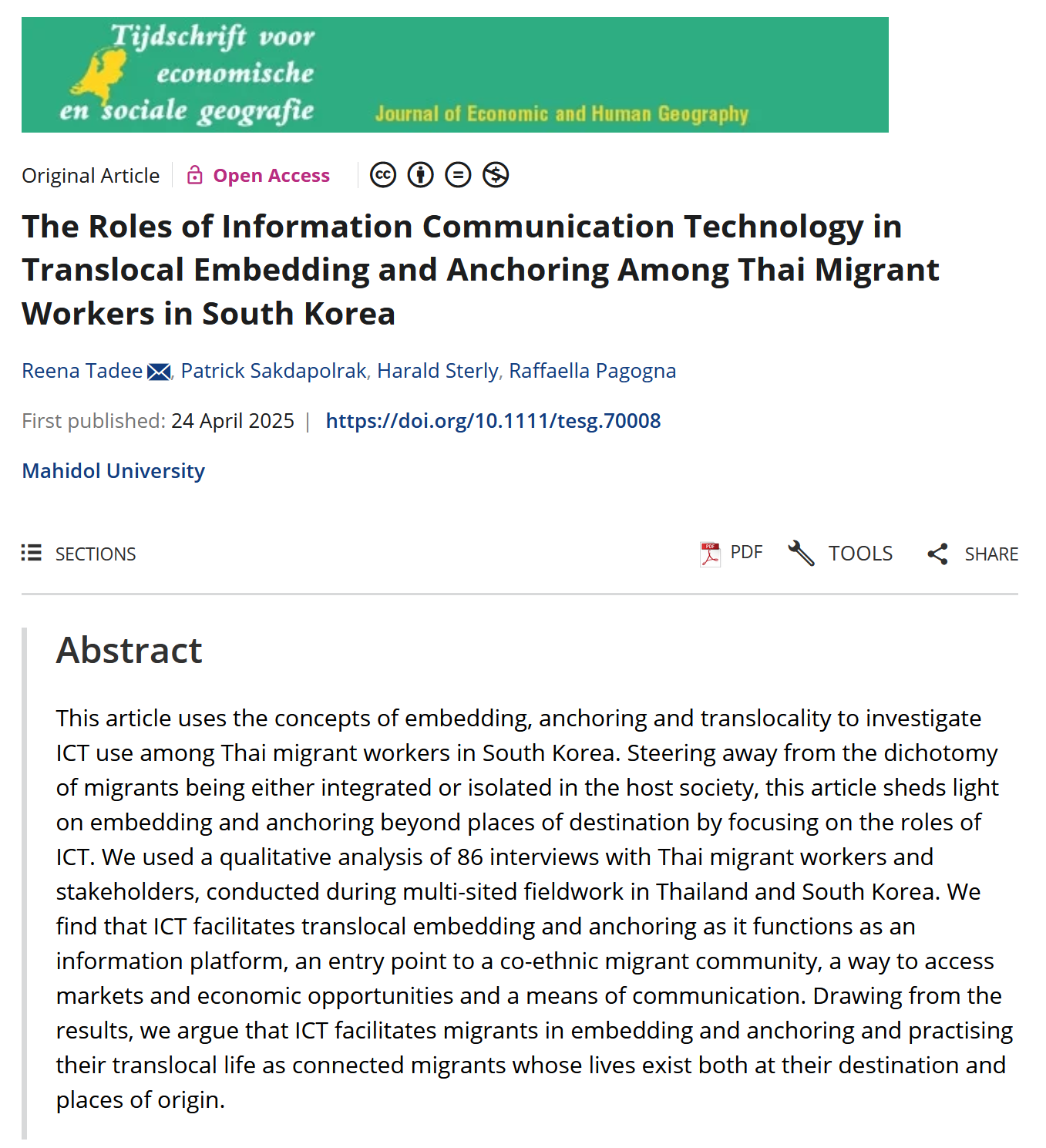 Tadee, R., Sakdapolrak, P., Sterly, H. and Pagogna, R. (2025). The Roles of Information Communication Technology in Translocal Embedding and Anchoring Among Thai Migrant Workers in South Korea. Tijds. voor econ. en Soc. Geog, https://doi.org/10.1111/tesg.70008