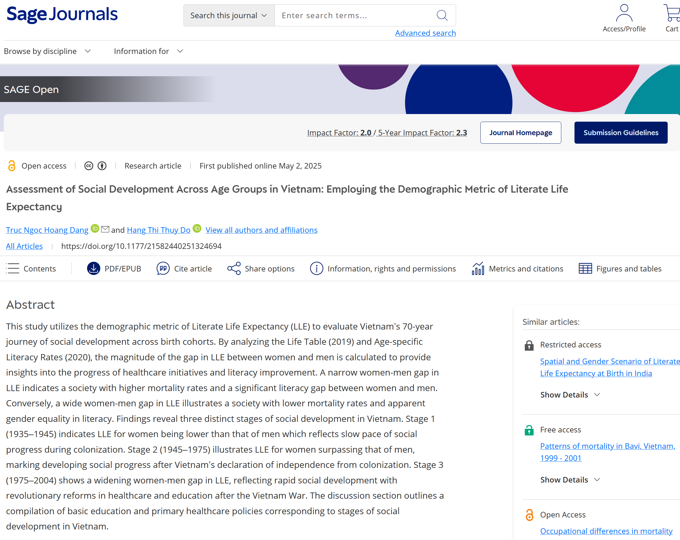 Dang, T. N. H., & Do, H. T. T. (2025). Assessment of Social Development Across Age Groups in Vietnam: Employing the Demographic Metric of Literate Life Expectancy. SAGE Open, 15(2). https://doi.org/10.1177/21582440251324694 (Original work published 2025)