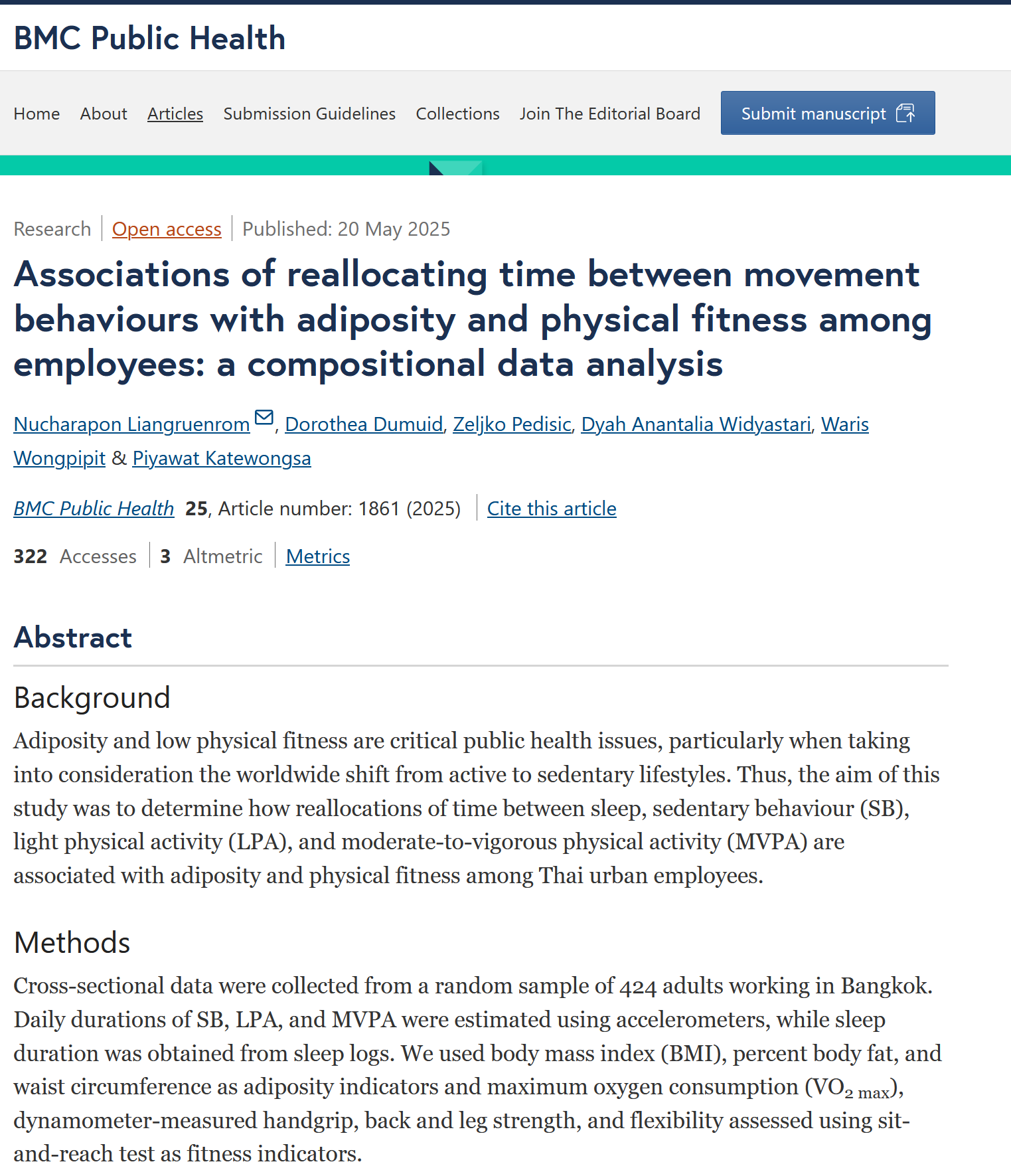 Liangruenrom, N., Dumuid, D., Pedisic, Z. et al. (2025). Associations of reallocating time between movement behaviours with adiposity and physical fitness among employees: a compositional data analysis. BMC Public Health, 25, 1861, https://doi.org/10.1186/s12889-025-23165-6