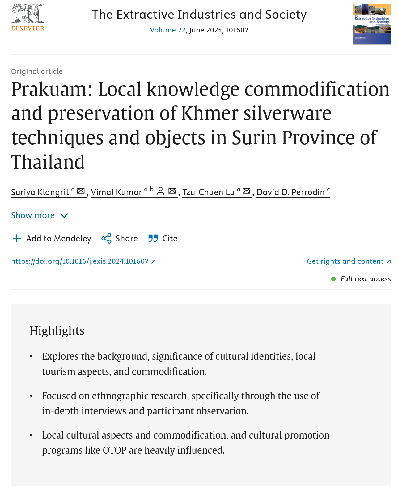 Klangrit S, Kumar V, Chuen Lu T, Perrodin D.D. (2025). Prakuam: Local knowledge commodification and preservation of Khmer silverware techniques and objects in Surin Province of Thailand. The Extractive Industries and Society. https://doi.org/10.1016/j.exis.2024.101607