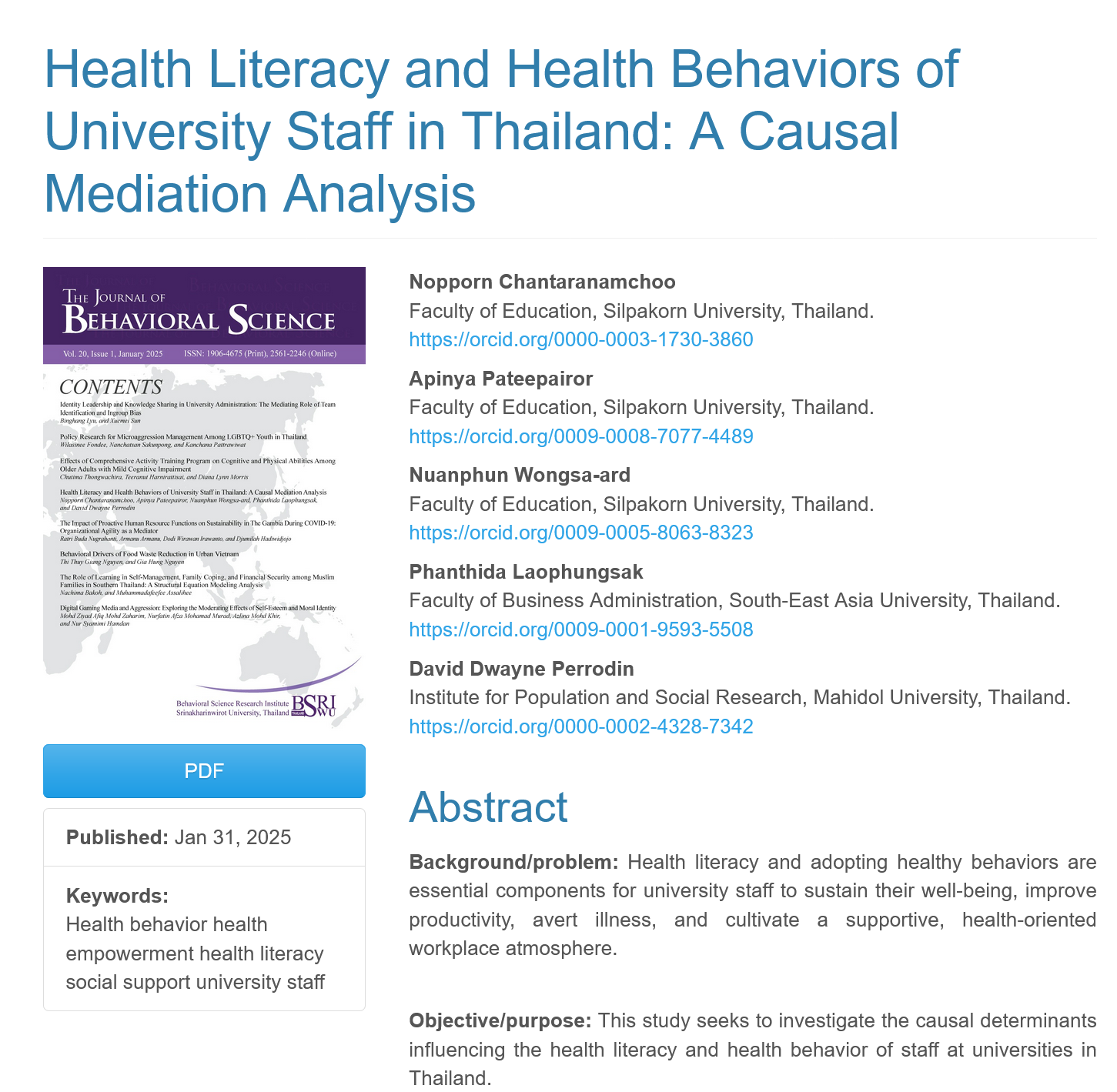 Chantaranamchoo, N., Pateepairor, A., Wongsa-ard, N., Laophungsak, P., & Perrodin, D. D. (2025). Health Literacy and Health Behaviors of University Staff in Thailand: A Causal Mediation Analysis. The Journal of Behavioral Science, 20(1), 47–60. retrieved from https://so06.tci-thaijo.org/index.php/IJBS/article/view/274731
