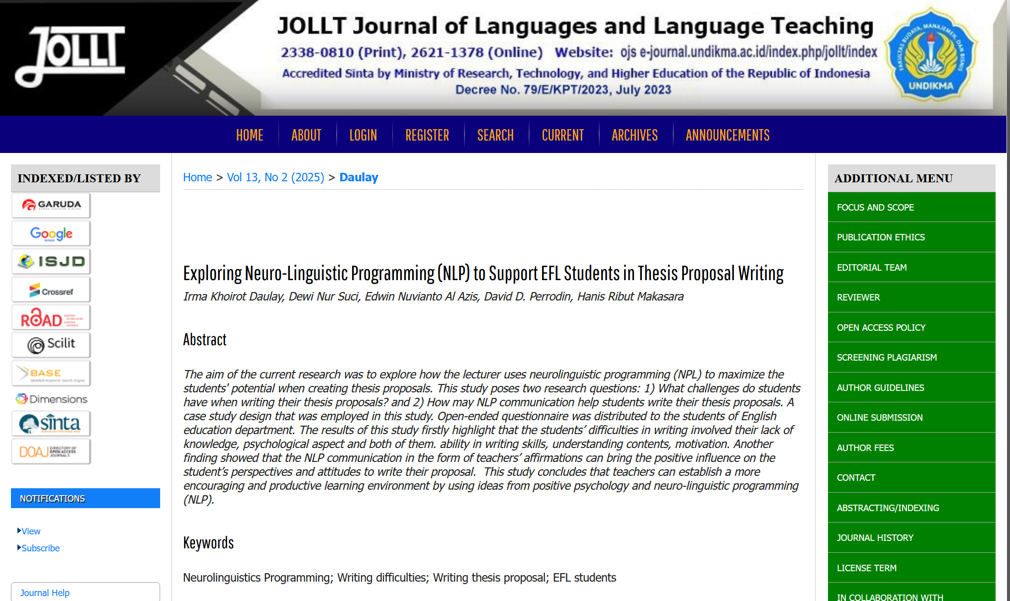 Daulay, I. K., Suci, D. N., Al Azis, E. N., Perrodin, D. D., & Makasara, H. R. (2025). Exploring neuro-linguistic programming (NLP) to support EFL students in thesis proposal writing. Journal of Languages and Language Teaching, 13(2), 772–784. https://doi.org/10.33394/jollt.v13i2.13656