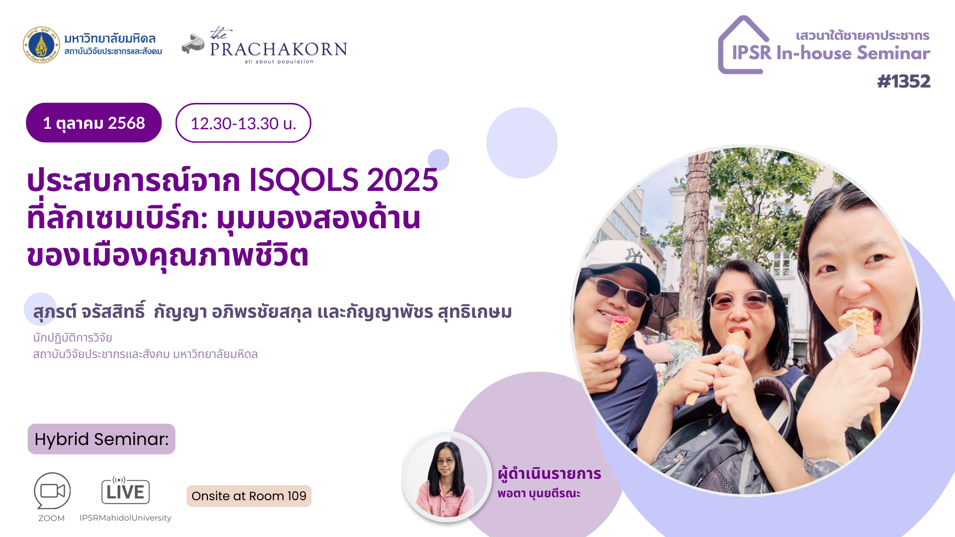 Speaker: คุณกัญญา อภิพรชัยสกุล, คุณกัญญาพัชร สุทธิเกษม และคุณสุภรต์ จรัสสิทธิ์ (นักปฏิบัติการวิจัย สถาบันวิจัยประชากรและสังคม มหาวิทยาลัยมหิดล)